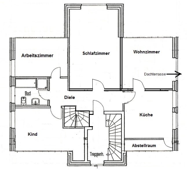Die Wohnung verfügt über insgesamt 3 Schlafzimmer, eine Küche inkl. Einbauküche mit Abstellraum, ein Tageslicht-Badezimmer mit Dusche und Badewanne sowie 2 Waschbecken und einem zusätzlichem Abstellraum im Flur.