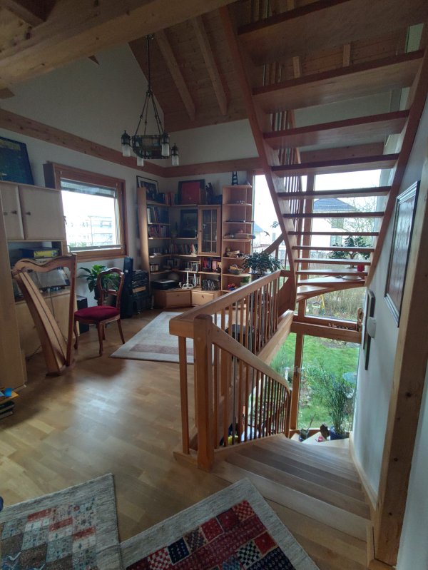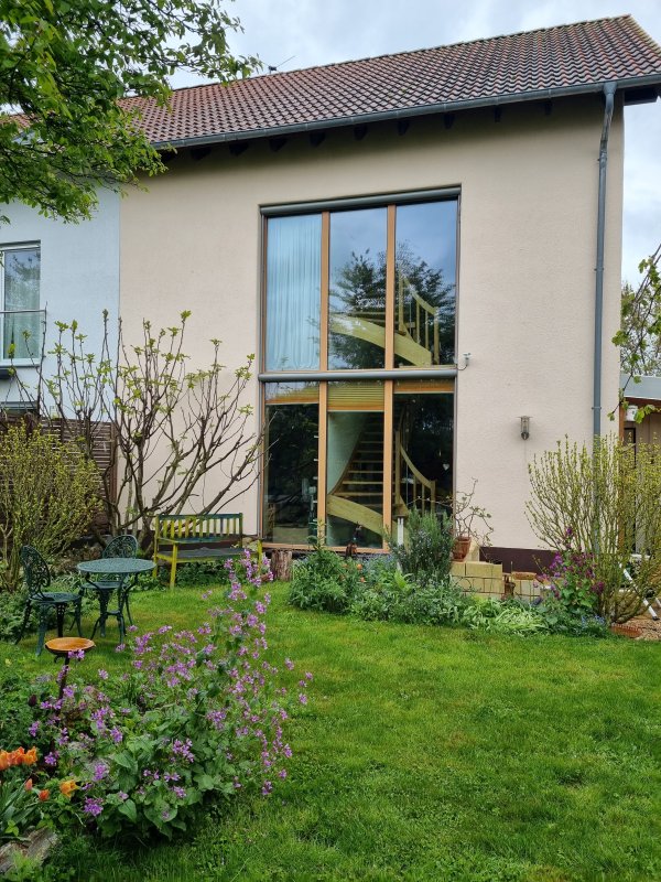 Lichtdurchflutetes schönes 5.5 Zimmer Reihenhaus in Friedberg mit verwunschenem Garten für zwei Jahre zu vermieten. Großzügige Wohnfläche(135 m2) in ökologisch gebautem Niedrigenergiehaus auf drei Etagen, mit vielen Fenstern und Fußbodenheizung, überdachter Sitzplatz mit Blick in den grünen Garten, 2 Auto-Stellplätzen, einer davon überdacht, und einem kleinen Schuppen. Miete 1800 Euro kalt. Die Mietdauer ist auf 1,5 bis maximal 2 Jahre beschränkt (Hauskauf nach dieser Zeit möglich).