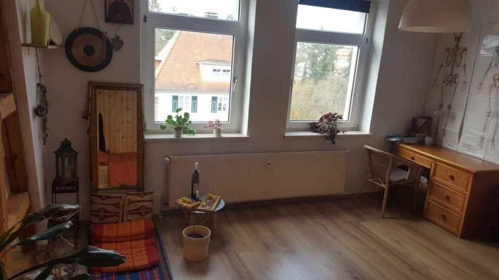 Nachmieter* für sehr schöne helle Dachgeschosswohnung gesucht. Hölzerne Türen und Türrahmen, aber auch der Wandteil am Bett sowie ein als Raumtrenner fungierender Dachbalken aus schönem warmen Naturholz geben der ganzen Wohnung ein einzigartiges und gemütliches Ambiente. Gerne wieder für neue Schüler* der Physiotherapie (oder auch andere, OTA, Pflege...) während ihrer Ausbildung.