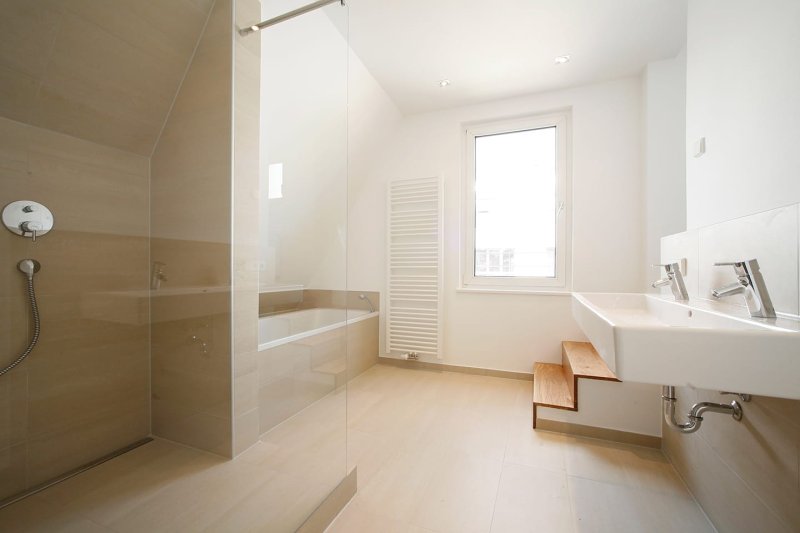 In der unteren Etage befindet sich ein separater Raum für Waschmaschine und Trockner. Insgesamt präsentiert sich die Wohnung sehr einladend und großzügig und ist ideal für Paare oder Familien, die zentral und dennoch ruhig wohnen möchten. Sie eignet sich ebenfalls perfekt als Kombination aus Wohnen und Arbeiten.