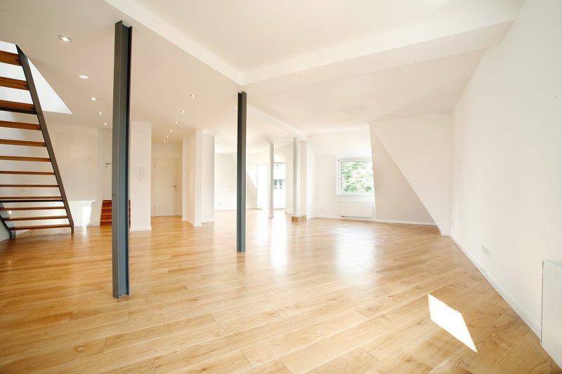 Eine offene Stahlwangentreppe mit Geländer betont den loftartigen Charakter der Wohnung und führt in die obere Etage, die zwei weitere Zimmer und ein Duschbad bietet. Zur Wohnung gehören zudem ein Stellplatz vor dem Haus und ein großer Abstellraum im Keller.