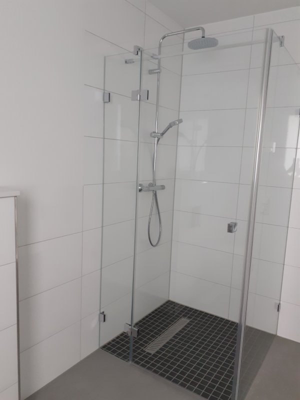 Das modern gestaltete Badezimmer verfügt über eine Dusche.