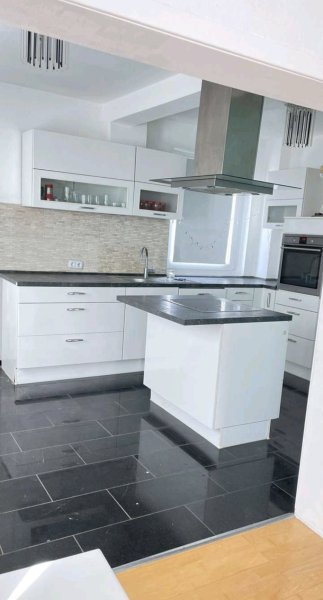 Neben 3 einladenden Zimmern und einen Esszimmer gehört in der Wohnung ein grosse offene Küche, ein Gäste WC und ein grosses Bad mit Dusche. Aus dem Balkon hat man eine wunderbare Aussicht auf einem ruhen begrünten Garten. Die Wohnung ist teilmöbliert, sie hat im Schlafzimmer einen grossen Kleiderschrank, im Kinderzimmer/Büro einen Einbauschrank, im Esszimmer einen Tisch mit Stühlen und eine Einbauküche mit AEG Elektrogeräten. Die Küche ist hochwertig und hat eine Kochinsel. Wenn die Möbel übernommen werden möchten, 500€ Übernahme (Ausser Küche)
