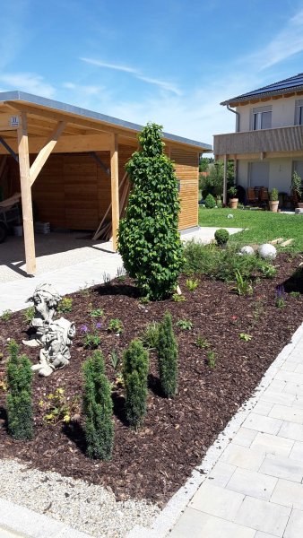 Ein Doppelcarport mit angrenzendem Lagerraum bietet ausreichend Platz für die Fahrzeuge und Sportgeräte von Eltern und Kindern.