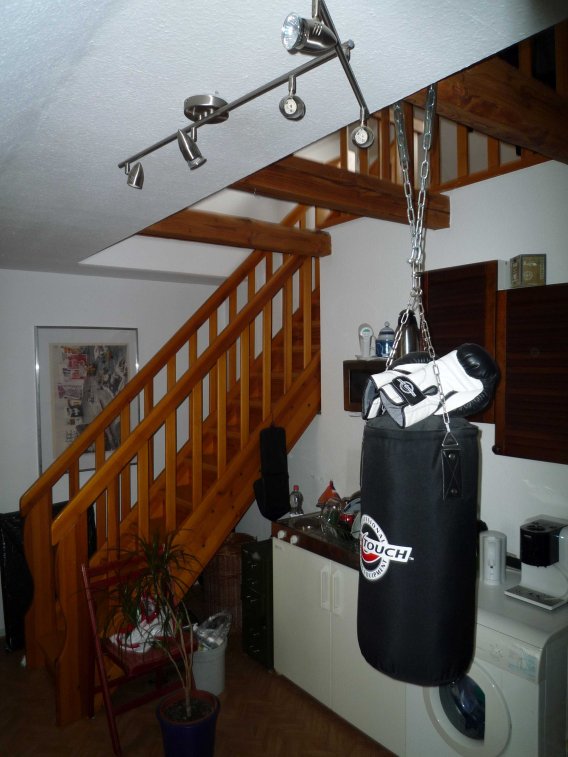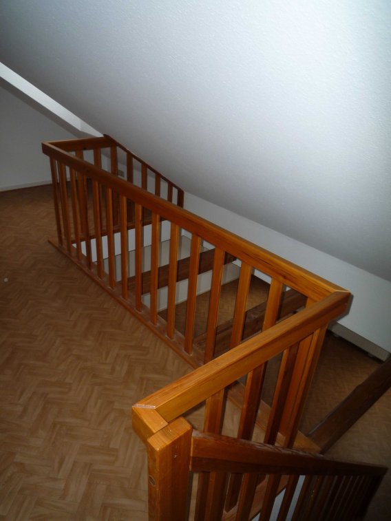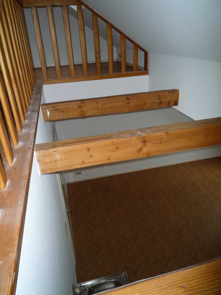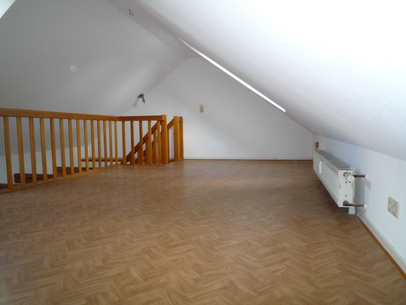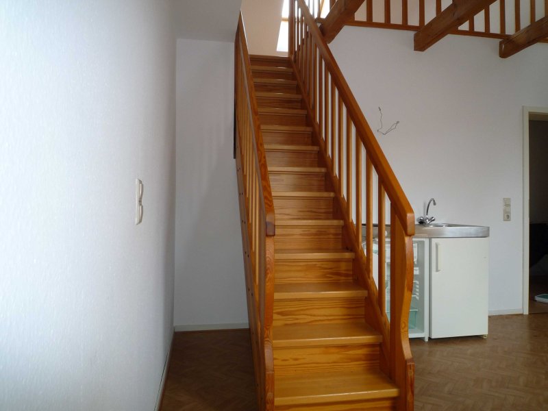 Das Zimmer hat einen unteren Teil, in dem auch die Pantryküche (2 Kochplatten, Kühlschrank, Waschmaschinenanschluss vorbereitet) aufgestellt ist. Über eine Treppe erreicht man die offene Galerie, die z.B. als Schlafbereich genutzt werden kann. 4 Dachflächenfenster sorgen für einen hellen freundlichen Eindruck.