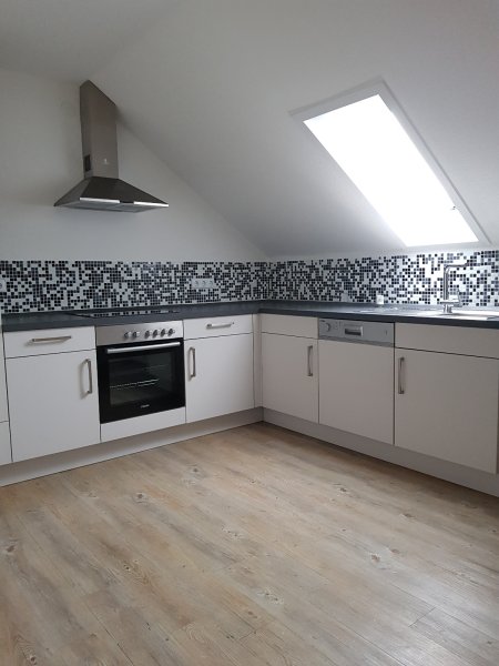 Küchenausstattung: Moderne Einbauküche mit Herd, Backofen, Kühlschrank und Spülmaschine.