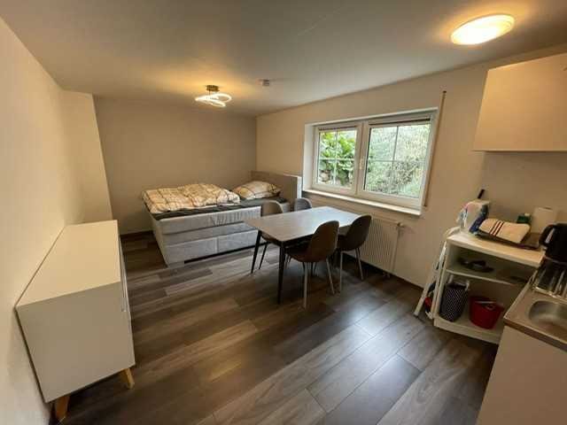 Das Apartment besteht aus einem schönen Zimmer mit dunklem Laminat und hat ein großes, nicht einsehbares Fenster in den Garten. Zudem ist eine neue Singelküche (auf den Bilder ist noch die ALTE Küche zu sehen!) installiert, die ein Spülbecken, ein Ceran-Kochfeld und einen kleinen Kühlschrank bietet und sowohl funktional als auch platzsparend ist. Für die Küche ist eine Ablöse von 500€ zu zahlen.