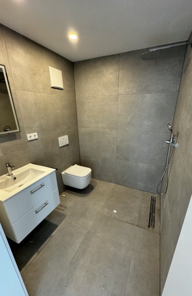 Appartement ist mit Lampen und Badeinrichtung bereits installiert.