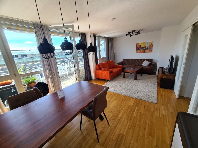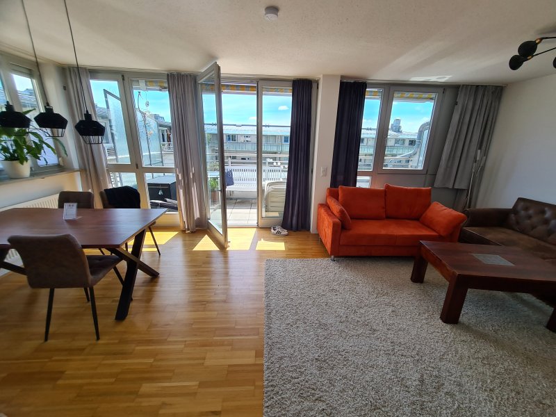 2 Zi Wohnung inkl. Tiefgarage, 2 Dachterrassen (Süden und Norden), Einbauküche, voll möbliert: TV (Kabelempfang), WLAN (Telekom Glasfaser)