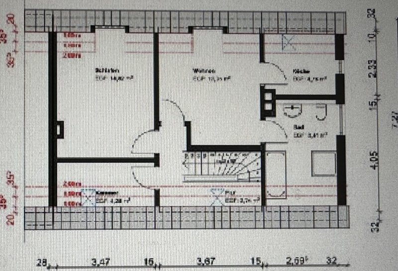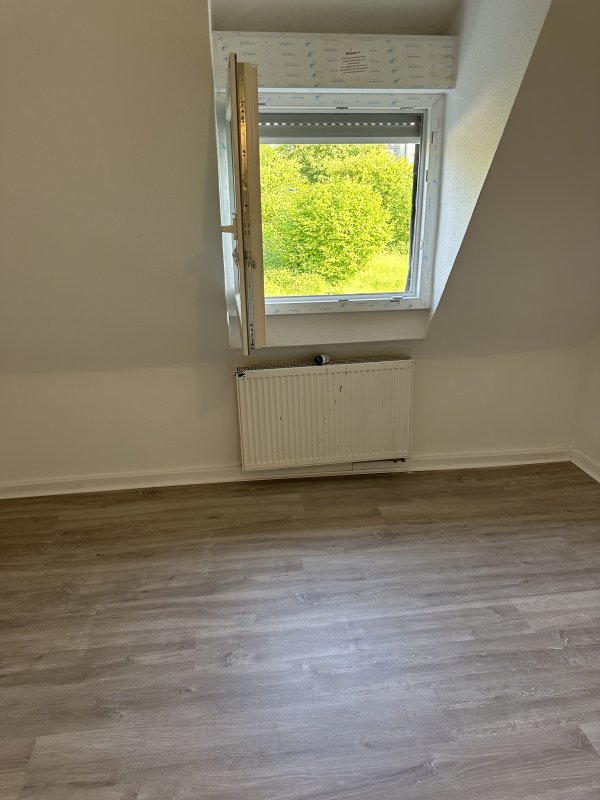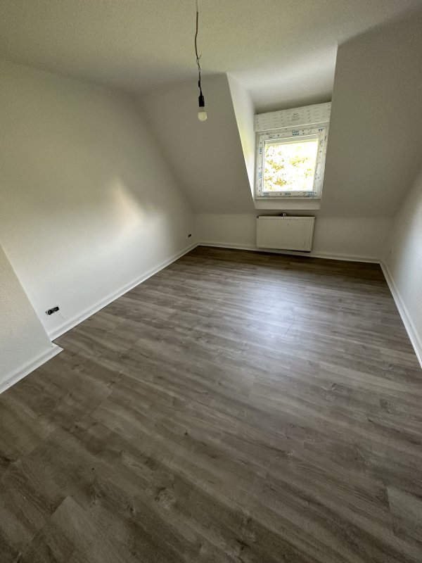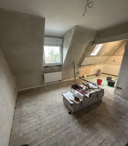 Die Wände sind teilweise schräg durch Gauben. Das Haus ist unbewohnt, der untere Bereich ist noch eine Baustelle. Der obere Bereich kann mit handwerklichen Geschickt gemütlich eingerichtet werden. Das Bad und die Küche muss selber eingerichtet werden.