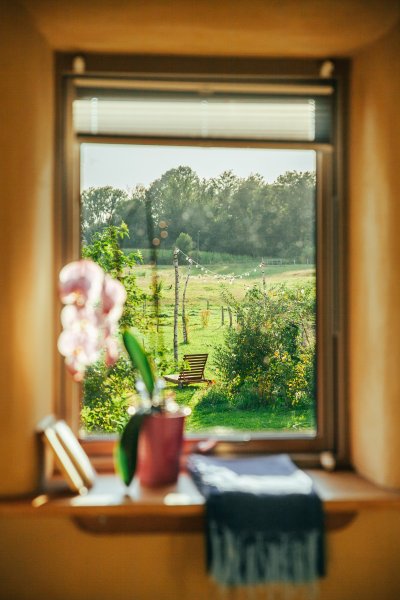 Das Bad und die Küche blicken auf die Felder, Pferdekoppel und in den Garten. Der Wohnbereich geht zur Straße raus. Diese ist sehr wenig befahren, da es sich um ein Sackgassendorf handelt und somit nur Anwohner und Landwirte die Straße benutzen.
