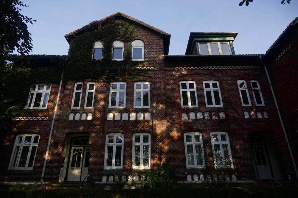 Denkmalgeschützter, zweigeschossiger, roter Backsteinbau über hohem Kellergeschoss mit Putzrustika. Eingangsbereiche auf beiden Hausseiten dreiachsig übergiebelt, seitlich risalartig vorspringender Eckbau mit Vorder- und Seitengiebel. Wandgliederung mit horizontalen Gesims- und Blendnischenbändern, die Eingangstüren mit Jugendstilelementen verziert. Auf ca. 9.000 qm großen, parkähnlichen Grundstück. mit Gartenfläche für den Anbau von Obst und Gemüse im Mietpreis enthalten.