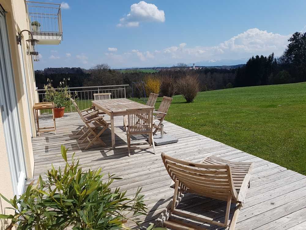 Dieses gepflegte Einfamilienhaus wurde 2003 mit einem weiteren EFH in Ziegelbauweise errichtet. Die drei Etagen sind mit Eckfenstern ausgestattet die einen sehr schönen Blick in die Berge ermöglichen. Hier finden Sie Platz für Wohnen, Freizeit und Arbeiten. Sie betreten das Haus über die große und helle Diele. Im Erdgeschoß befindet sich der großzügige Wohn- und Essbereich mit offener Küche, über den Sie auch die Terrasse und Ihren eigenen Garten erreichen. Von der 30qm großen Holzterrasse aus, haben Sie einen wunderschönen und unverbauten Blick in die Berge.