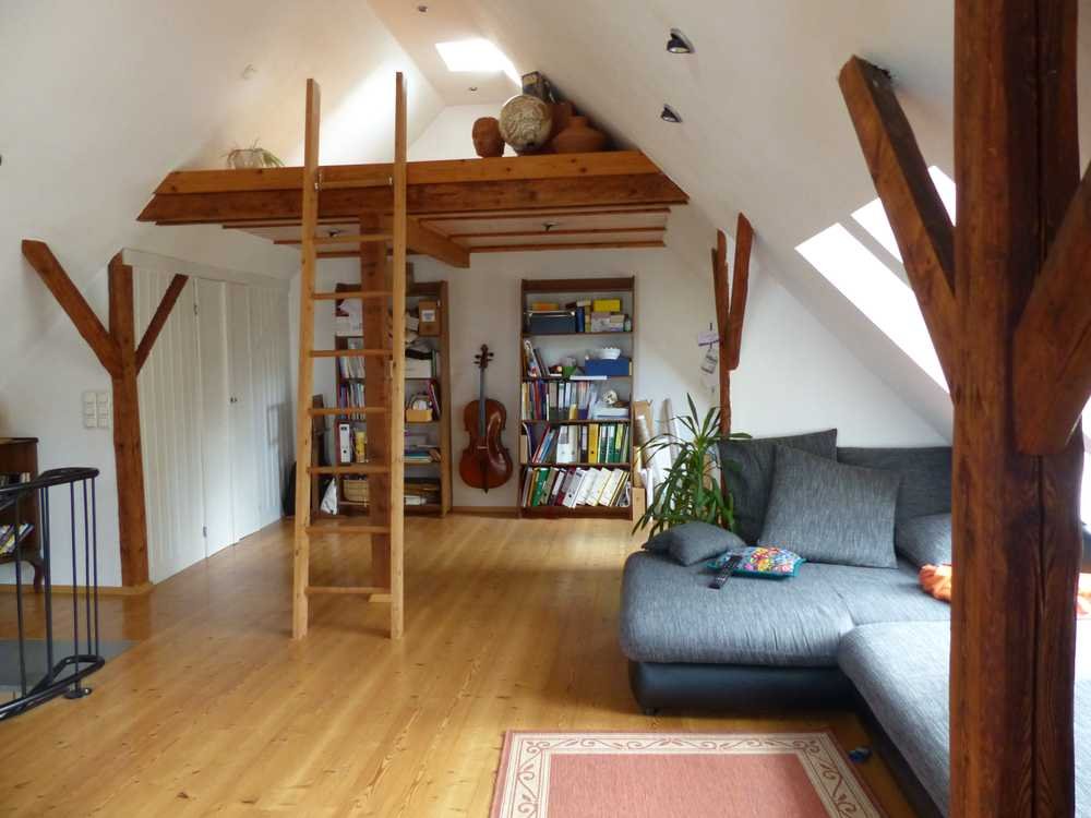 Im Erdgeschoss finden sich Küche, Esszimmer, Schlafzimmer, Toilette und Bad. Über eine Wendeltreppe ist das großzügige und helle Wohnzimmer im Dachgeschoss zu erreichen. Eine Empore im Wohnzimmer kann z.B. als Gästeschlafplatz genutzt werden. Nach Süden liegt eine gepflasterte Terrasse, die über Ess- und Schlafzimmer zugänglich ist. Eine ehemalige Garage dient als Abstellraum. Ein Stellplatz kann dazu gemietet werden.