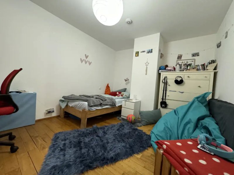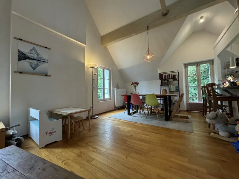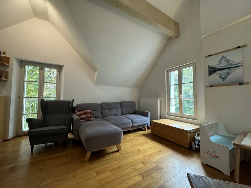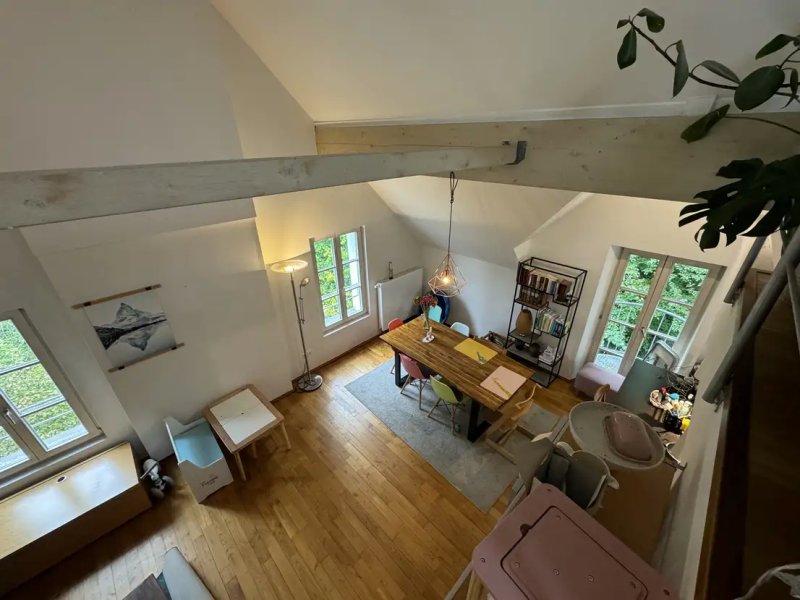 Die recht moderne Wohnung erstreckt sich hauptsächlich über die oberen zwei Etagen des Gebäudes, wobei sich der Wohnungseingang im Erdgeschoss befindet.
