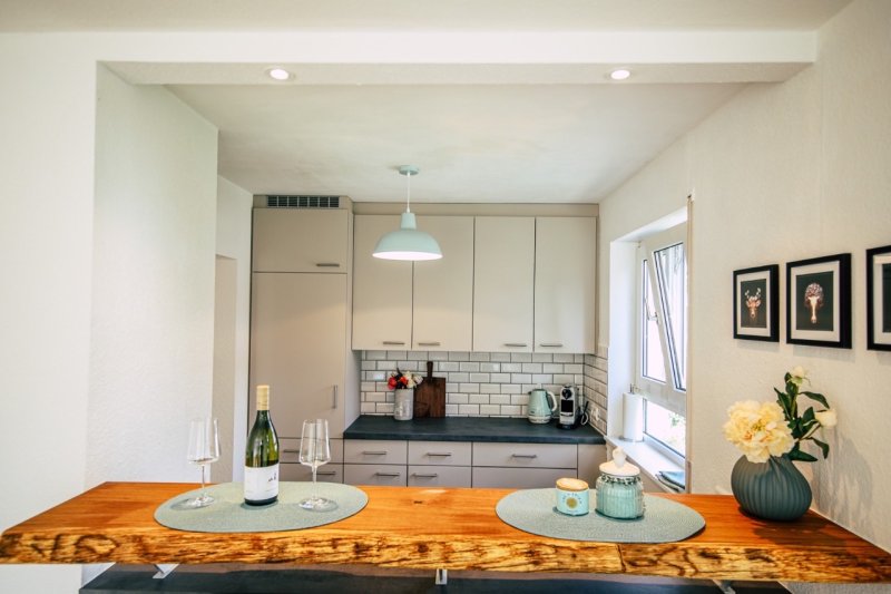 Die Wohnung liegt am Rande von  Gundelfingen direkt an der Stadtgrenze zu Freiburg und  ist voll hochwertig ausgestattet - modern mit Schwarzwald Flair. Die neue Einbauküche mit Echtholztheke bildet das Herzstück der Wohnung. Die Wohnung ist voll ausgestattet (Töpfe, Teller, Wasserkocher, Waschmaschine etc.) . Im Schlafzimmer erwartet Sie ein hochwertiges Bett aus echtem Altholz aus dem Kinzigtal mit hochwertigen Auflagen.