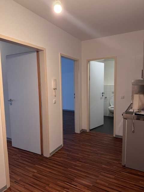 Betritt man die Wohnung steht man im Eingangsbereich mit bereits integrierter Küchenzeile zur rechten Handseite und einem Einbauschrank auf der gegenüberliegenden Seite.