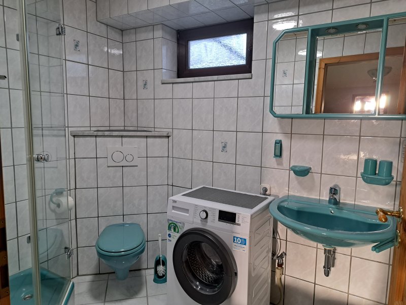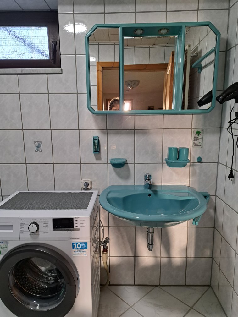 Das Bad umfasst eine Dusche, WC, Waschbecken, Waschmaschine, Spiegelschrank und einen Fön.