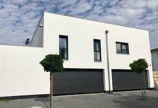 Das Haus ist in einem stylisch kubistischen Stil ganz in weiß gestrichen.. Die Fenster und die Garagentore sind anthrazit. Das ist supermodern und gleichzeitig zeitlos.