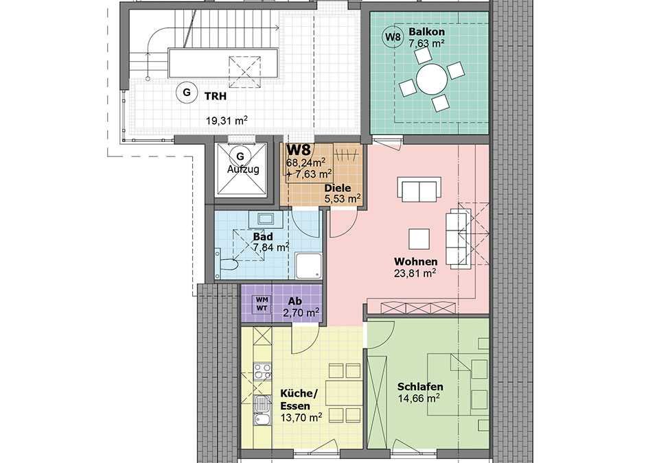 Ihnen stehen außerdem ein Stellplatz für Ihr Auto und ein Kellerraum im Untergeschoss zur Verfügung.