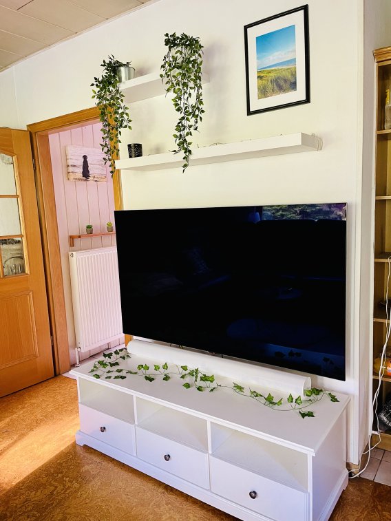 ➡️ Wohnzimmer: Ausziehbares Sofa und moderner Smart-TV
