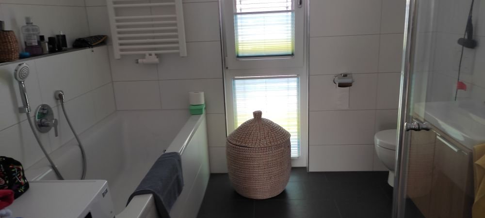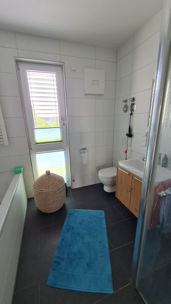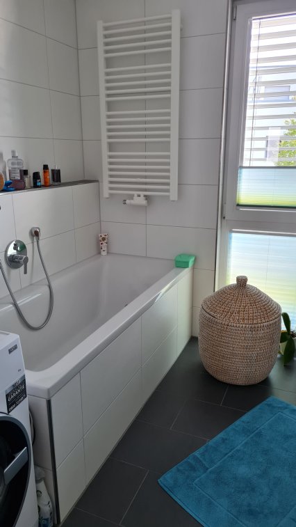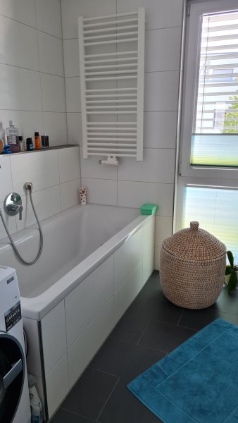 Das Bad verfügt über ein WC, Waschtisch mit Unterschrank, Spiegel, Badewanne und eine ebenerdige Dusche, sowie Fußbodenheizung. Ein Waschmaschinenanschluss ist vorhanden.