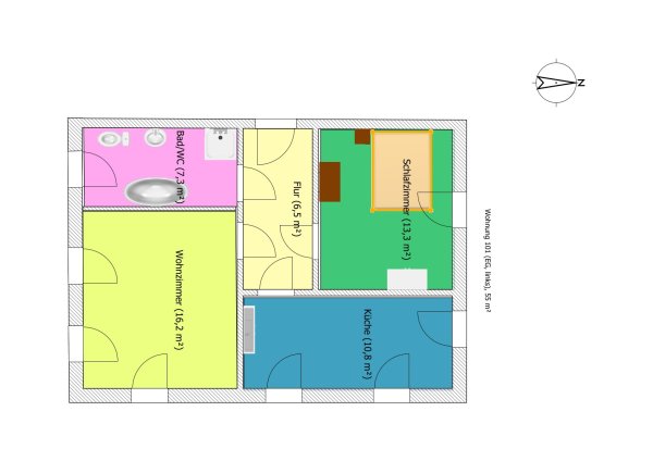 Wohnung befindet sich im Erdgeschoss mit Wohn- und Schlafzimmer sowie Küche, Bad und Flur.