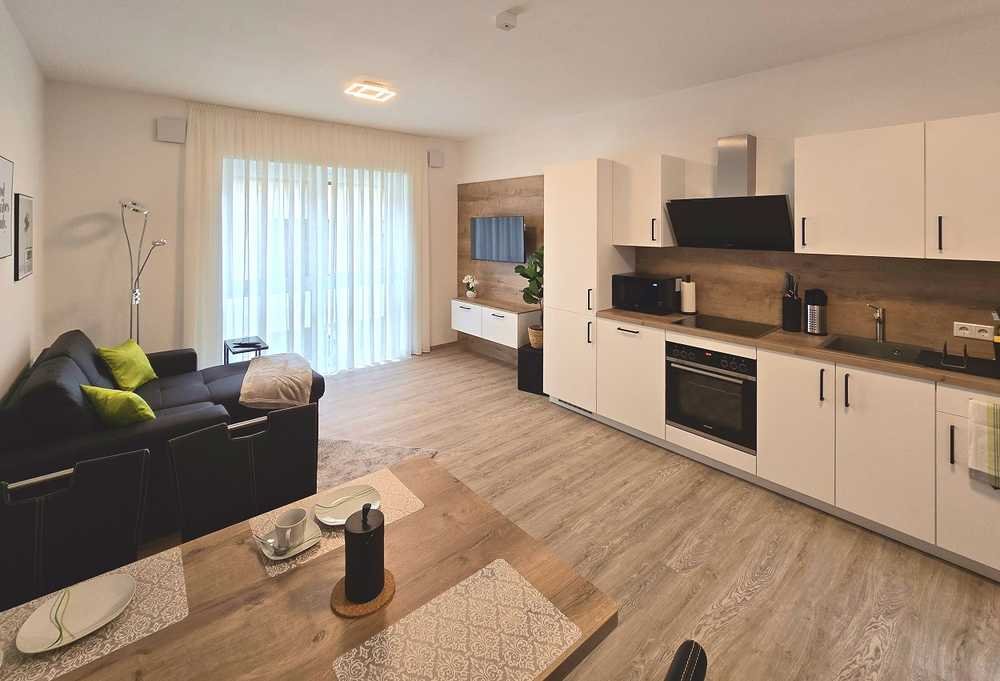 Neubau 2-Zimmer-Apartment, separates Bad mit Dusche, Einbauküche, voll möbliert und ausgestattet für Single oder Pärchen.