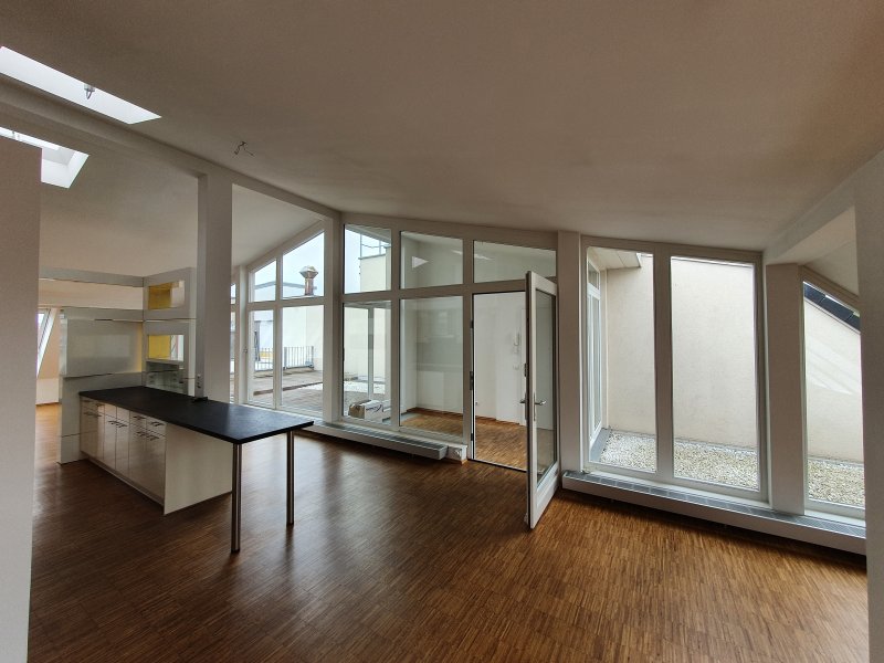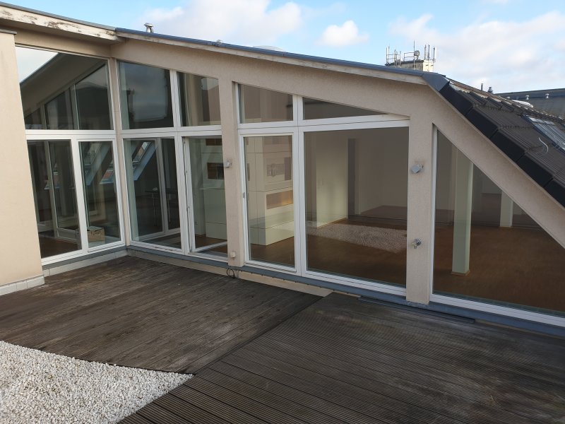 Freuen Sie sich auf eine gepflegte Dachgeschosswohnung mit Blick über den Dächern von Berlin. Durch ein nicht frei zugängliches Tor gelangen Sie in das ruhige Hinterhaus, in dem sich früher eine Fabrik befand. Über einen Fahrstuhl gelangen Sie in den 5.Stock, in dem sich nur diese Wohnung befindet. Zur Wohnung gehört eine schöne Dachterrasse. Zu allen Seiten befinden sich viele Fenster, die zu einer sonnigen Umgebung beitragen.
