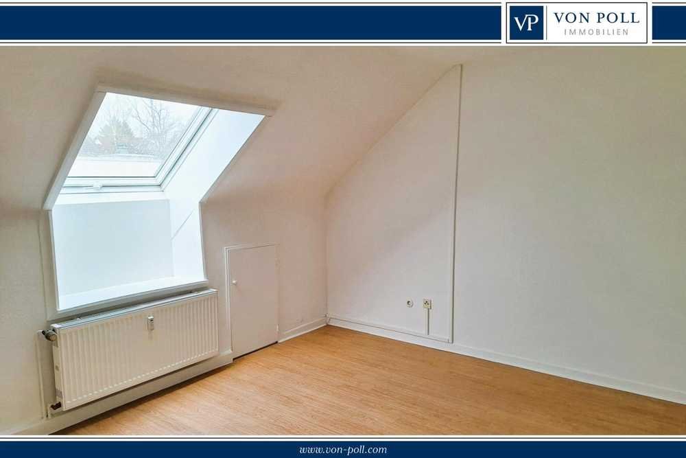 Die Wohnung befindet sich in einem Mehrfamilienhaus und besteht aus einem Zimmer mit einem Dachfenster und Dachschrägen.