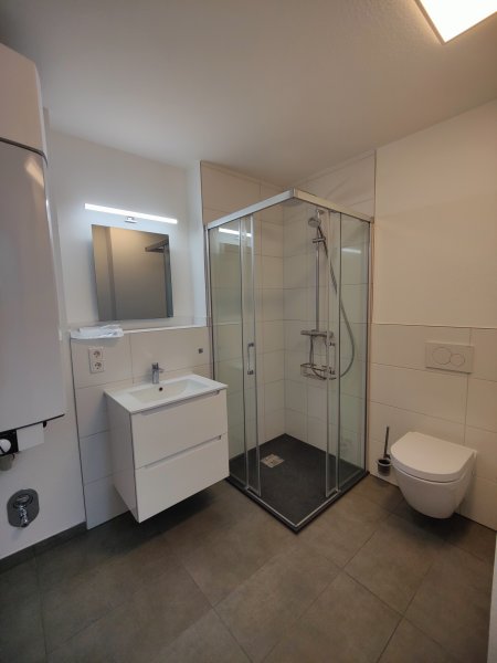 - Moderne Badezimmer: Dusche/WC, Spiegel, Waschtisch