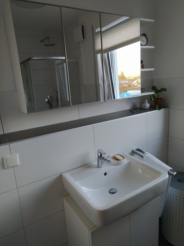 Badezimmer mit Fenster, gefliest, ausgestattet mit Waschbecken mit Unterschrank, Toilette und bodengleicher Dusche, großem Spiegelschrank und Handtuchheizkörper