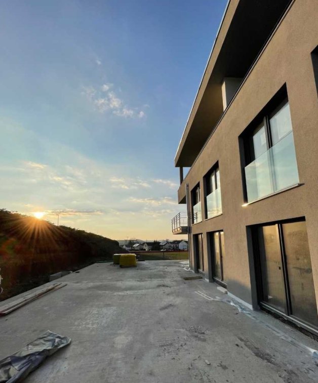 (Eine vergleichbare 3,5-Zimmer-Wohnung im 1. Stock mit Balkon und herrlichem Ausblick ist momentan auch noch verfügbar. Außerdem zwei 2,5-Zimmer-Wohnungen mit jeweils ca. 50qm im EG bzw. OG mit Terrasse/ Garten bzw. Balkon .)