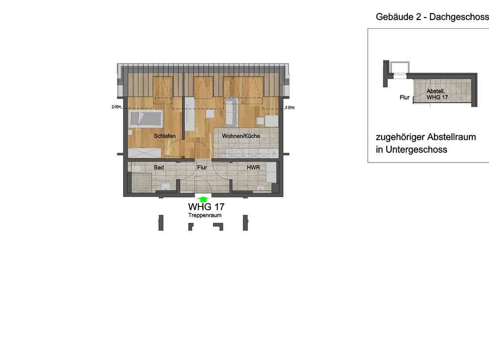 ie Wohnungen sind zwischen 50 und 90 qm groß. Der Großteil der Wohnungen verfügt über einen Balkon oder eine Terrasse. Alle Wohnungen verfügen über ein Schlafzimmer, Badezimmer mit bodengleicher Dusche, einen Hauswirtschaftsraum sowie einen offenen Wohn-Ess-Bereich. Jeder Wohnung ist darüber hinaus ein Abstellraum im Keller zugeordnet. Die attraktiven, modernen Wohnungen in den Obergeschossen und der Keller sind bequem mit dem Aufzug erreichbar.