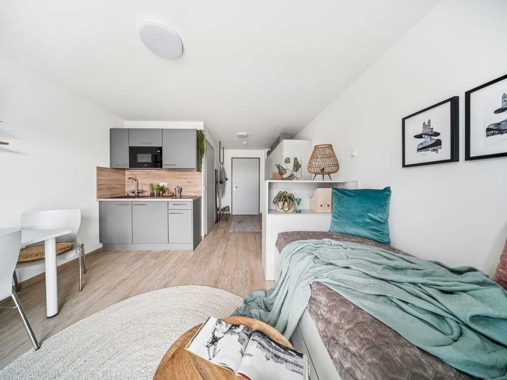 Hier trifft Funktionalität auf Stil: Die Apartments überzeugen durch clevere Grundrisse, hochwertige Materialien und eine zeitgemäße Möblierung bestehend aus Kleider- und Abstellschränken, einem Kastenbett, Regalen bzw. Raumteilern, sowie einem Ess-/Schreibtisch. Von lichtdurchfluteten Wohnräumen mit bodentiefen Fenstern bis hin zu Fußbodenheizung und modernen Einbauküchen mit Spüle, Kochfeld, Dunstabzugshaube, Mirowelle und Kühlschrank ist alles darauf ausgelegt, deinen Alltag so angenehm wie möglich zu gestalten. Einige Wohnungen bieten sogar das Extra einer Terrasse, eines Balkons oder einer Dachterrasse. Neben den Anforderungen an ein KfW-Effizienzhaus 55 (GEG) erfüllt der Neubau auch die Vorschriften des erhöhten Schallschutzes, verfügt über eine effiziente Be- und Entlüftungstechnik, sowie elektrisch betriebene Außenrollos. Die gärtnerische Gestaltung der Gemeinschafts- und Nutzflächen umfasst Rasenanlagen, Baum- und Strauchpflanzungen, Sitzbänke im Freien, sowie Stellflächen für Pkw und Fahrradbügel.