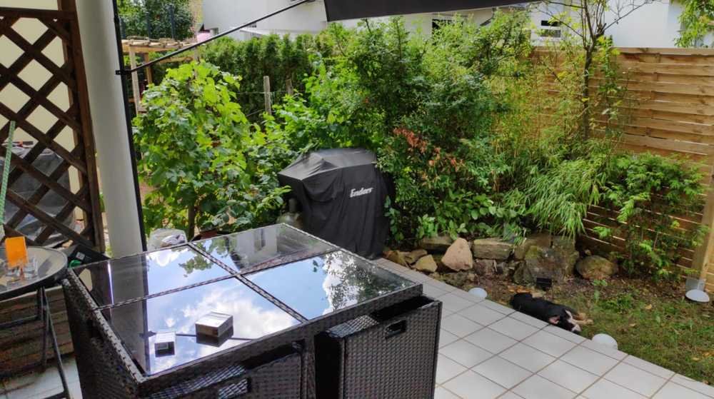 Die Terrasse ist überdacht, außerdem gehört ein kleiner Garten zur Wohnung. Zur Wohnung gehört ein Kellerraum und - optional gegen Aufpreis- ein PKW-Stellplatz.