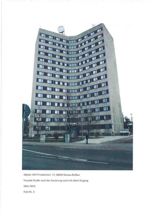 Das Objekt liegt im Herzen von Dessau am Rande des Stadtparks. Es wurde im Rahmen der Maßnahme "Rekonstruktion Stadtzentrum" 1970 errichtet. Das Gebäude hat 13 Etagen mit ca. 85 Wohnungen. Diese wurden mit großem Aufwand ab dem Jahr 2013 komplett saniert und vor allem modernisiert.