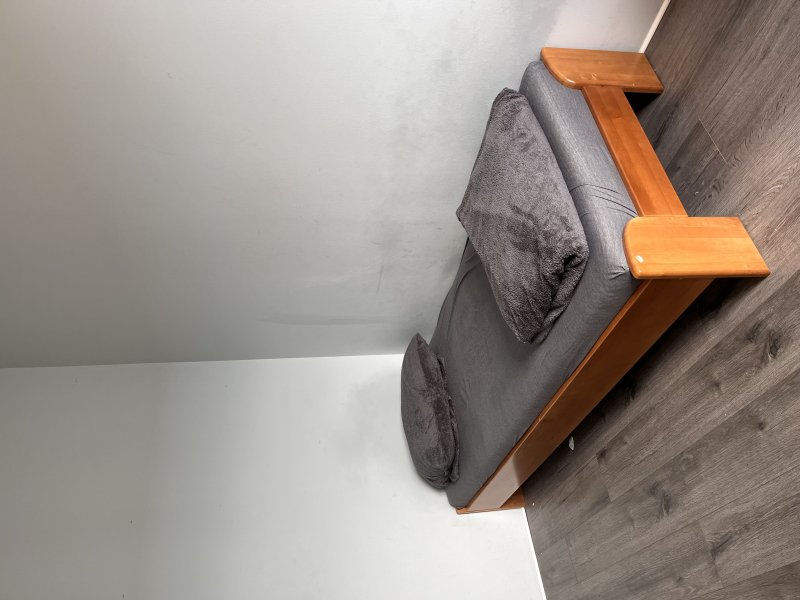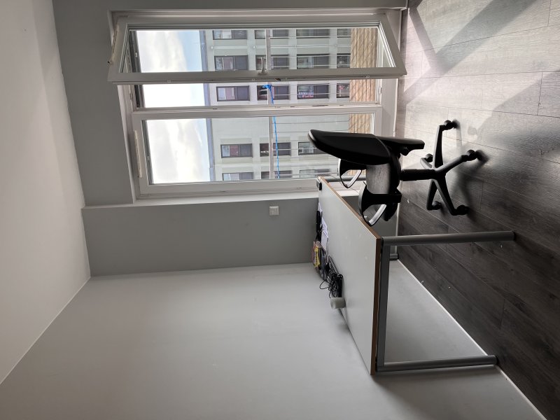 Ein Zimmer mit einer schönen Terrasse, einem Einzelbett mit Matratze, einem Kleiderschrank, einer Kleiderstange, einem großen Schreibtisch und einem Drehstuhl.