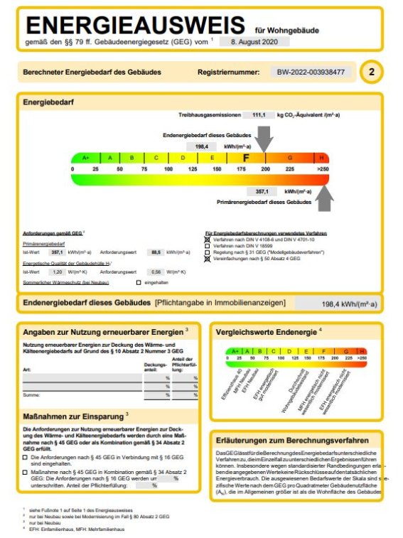 | Endenergiebedarf: | 198,40 kWh/(m²*a) |