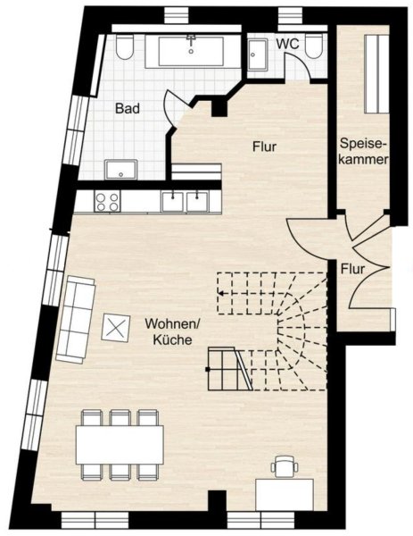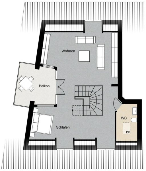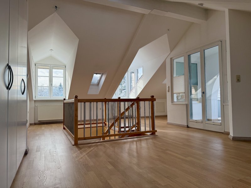 Ein echter Blickfang im Raum ist die elegant geschwungene Treppe, die Sie direkt ins Dachgeschoss führt. Hier können Sie sich einen gemütlichen Schlafbereich einrichten und einen zusätzlichen Wohnbereich gestalten. Ein separates WC mit Anschlüssen für Waschmaschine und Trockner ergänzt diese Etage perfekt.