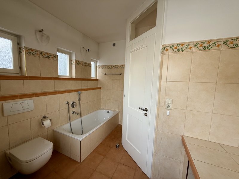 Im 1. Obergeschoss erwartet Sie ein lichtdurchfluteter, einladend gestalteter Wohn- und Essbereich mit einer hochwertigen Einbauküche, die gemeinsame Kochabende zum Vergnügen macht. Das gemütliche Badezimmer verfügt über Badewanne, großen Waschtisch und WC. Nebenan befindet sich die Gästetoilette inklusive Dusche. Abgerundet wird der Eingangsbereich mit einer kleinen Garderobe und separat zugänglicher Vorratskammer.