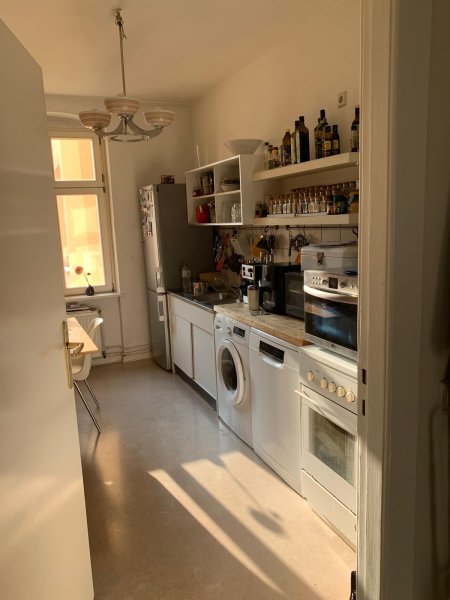Die Küche wird aktuell sogar neu eingerichtet und gestrichen. Das Wohnzimmer (auf dem Foto ist es noch ein Studentenzimmer) wird aktuell ebenfalls neu möbeliert und ist Ende April, Anfang Mai neu.