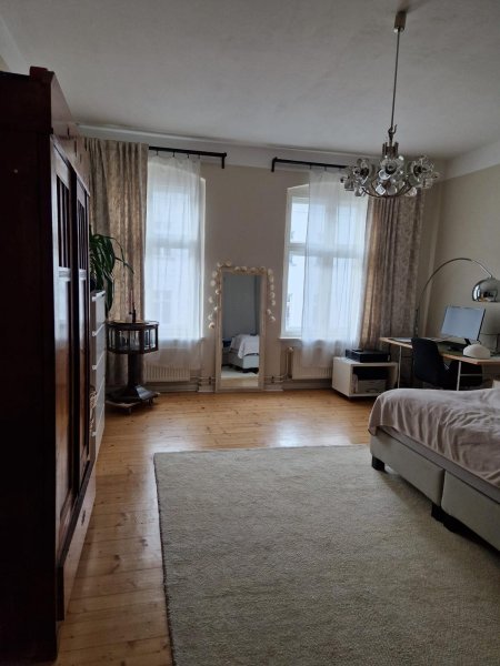Das 1. zu vergebene Zimmer ist sehr leise und zum Hinterhof gelegen und hat 15 qm. Das zweite Zimmer ist nach vorne zur Straße gelegen und hat 25 qm. Die Wohnung besteht insgesamt aus drei Zimmern (85 qm).