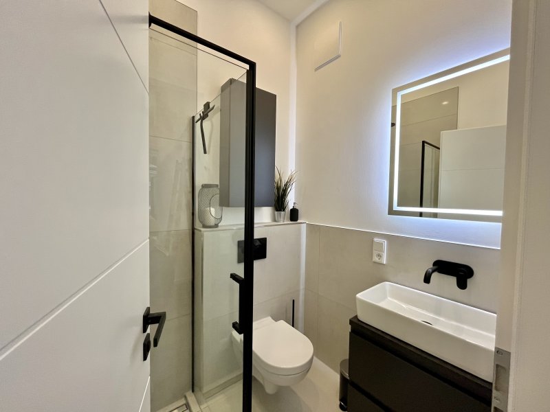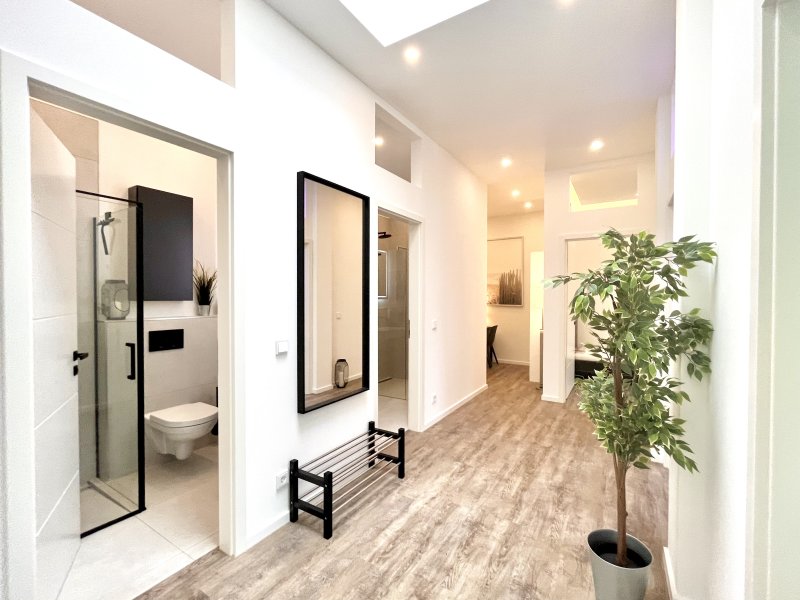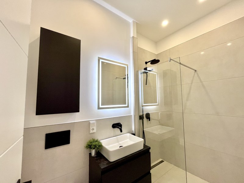 Die Wohnung verfügt weiter über zwei neu eingerichtete Bäder mit jeweils einem Waschtisch und LED-Spiegel, einem Handtuchheizkörper, einer Dusche sowie WC.
