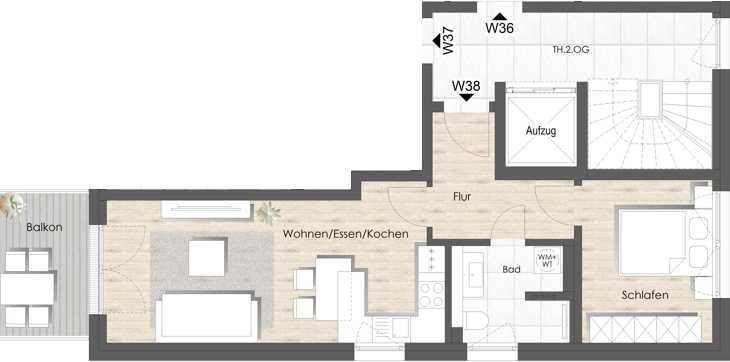 Am Ende des Flures erreichen Sie den lichtdurchfluteten offenen Wohn- und Essbereich, welcher Ihnen Zugang zum westlich ausgerichteten Balkon ermöglicht.