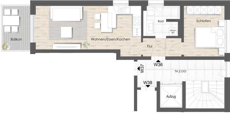 Beim Betreten der Wohnung werden Sie von einem einladenden Flur empfangen, der den Zugang zu sowohl dem Tageslichtbad als auch dem offenen Wohn- und Essbereich ermöglicht. Das Schlafzimmer ist ebenfalls über diesen zentralen Bereich erreichbar. Der Flur bietet ausreichend Platz für eine Garderobe.