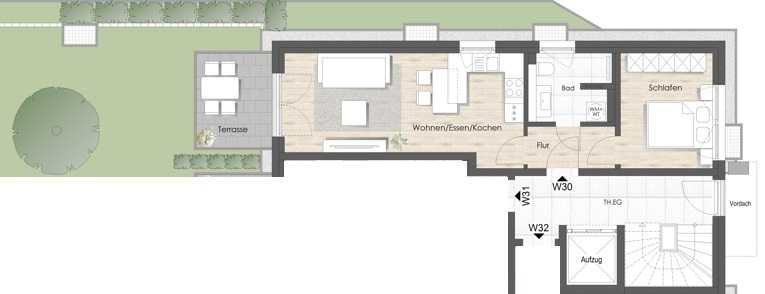 Beim Betreten der Wohnung werden Sie von einem einladenden Flur empfangen, der den Zugang zu sowohl dem Tageslichtbad als auch dem offenen Wohn- und Essbereich ermöglicht. Das Schlafzimmer ist ebenfalls über diesen zentralen Bereich erreichbar. Der Flur bietet ausreichend Platz für eine Garderobe.