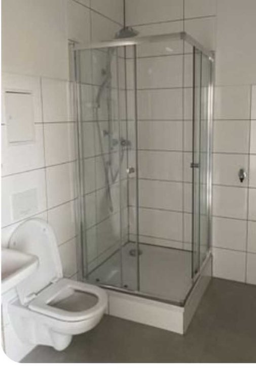 ein modernes, eigenes Badezimmer mit Dusche und praktischem Waschmaschinenanschluss