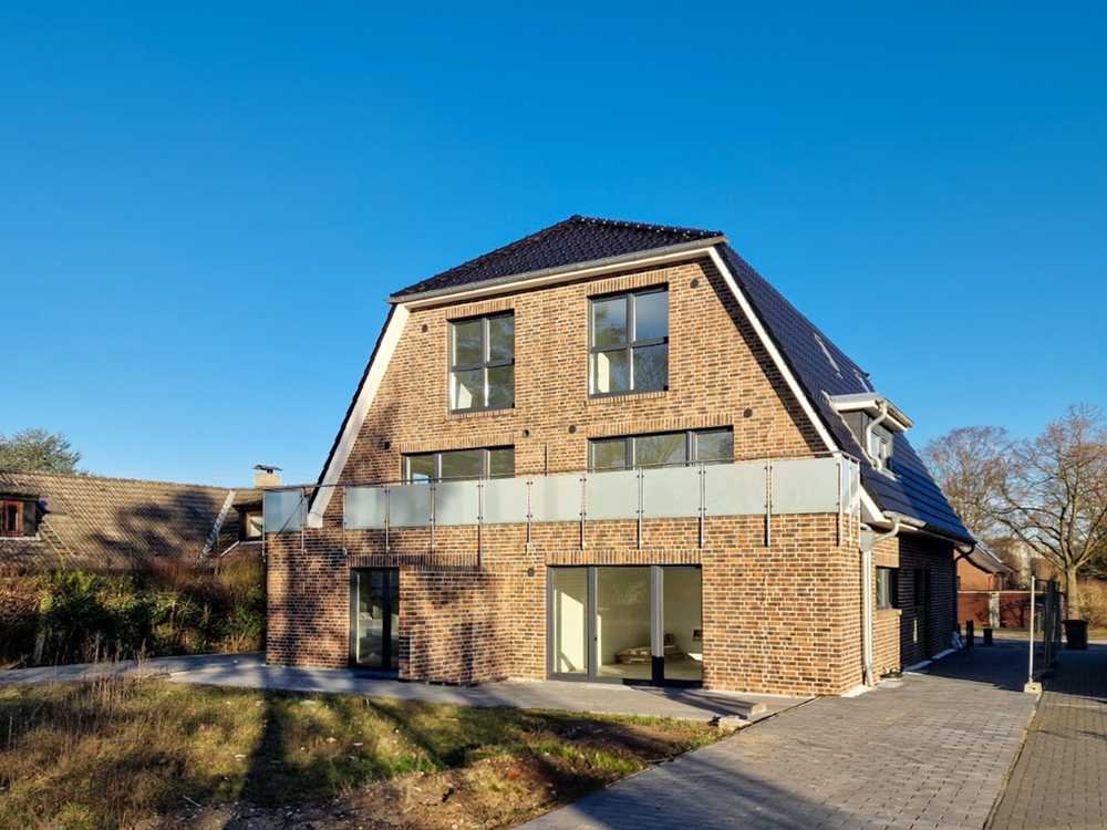 Zur Wohnung gehören zwei separate Außenstellplätze sowie gemeinschaftlich nutzbare Räume für Fahrräder und Kinderwagen. Die moderne Fassade aus dunkelbraunem Klinker rundet das stimmige Erscheinungsbild des Neubaus ab.