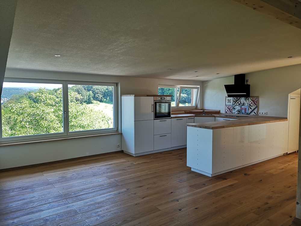 Die im Jahr 2020 kernsanierte DG-Wohnung, die im ersten OG liegt, besticht durch eine gehobene Innenausstattung, traumhaftem Ausblick auf die Burg Rötteln und kann zum 01.02.2026 bezogen werden. Nach Absprache ist auch ein Bezug im Janaur möglich. In der gesamten Wohnung ist Fußbodenheizung sowie hochwertiges Echtholzparkett verlegt. Die Einbauküche ist mit einem großen Ceranfeld, Ofen, Spülmaschine, grosser Kühlschrank mit Gefrierfach und einer kopffreien Dundsatabzugshaube (außen) ausgestattet. Neben der Küche befindet sich noch eine Abstellkammer.